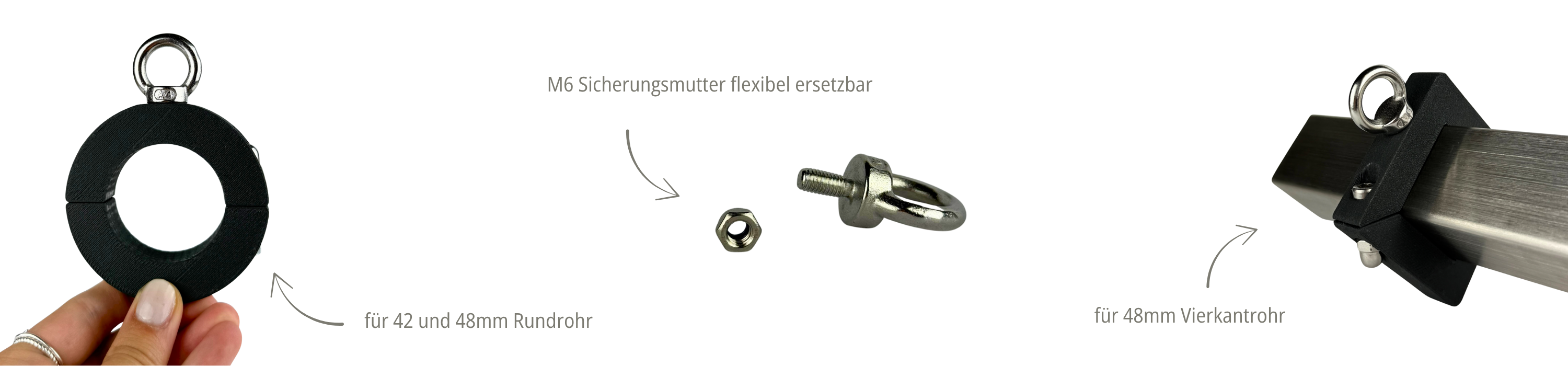 Schnell montiert, stabil befestigt und rückstandslos wieder entfernbar! Diese selbst entwickelte Klemmhalterung ist die perfekte Lösung für Befestigungen an Vierkantrohren ohne zu bohren! Die stabile Konstruktion ermöglicht eine vielseitige und sichere Anbringung verschiedenster Aufsätze. Dank der integrierten M6 Sicherungsmutter lässt sich z. B. eine Ringschraube (im Set enthalten) oder ein anderer Befestigungspunkt nach Wunsch montieren. Bestandteile des Klemmhalterung-Sets:2 passgenaue Klemmbacken aus Kunststoff für ein Vierkantrohr1 Edelstahl Ringschraube (M5-M12) 1 Edelstahl Sicherungsmutter (M6) 2 Edelstahl Hutmuttern 2 Edelstahl Schrauben zur FixierungFür was kann ich die Klemmhalterung verwenden?Befestigung am Balkon oder GeländerMontage eines Sonnensegels Temporären Befestigungslösungen bei Veranstaltungen oder auf BaustellenDIY Projekte im Garten oder Outdoorbereich Und vieles mehr! Die Klemmhalterung ist die ideale Lösung für alle, die auf Bohrungen verzichten und dennoch etwas stabil an einem Rundrohr befestigen wollen!